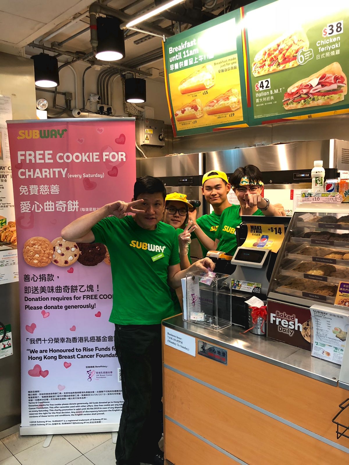 Subway--港鐵彩虹站 位於港鐵彩虹站的Subway店由即日起至2019年6月30日為香港乳癌基金會籌款,除於店內放置籌款箱,每逢星期六,顧客每購買潛艇堡乙個均可獲送曲奇餅乙塊。推廣期至30/6/2019,請踴躍支持! |