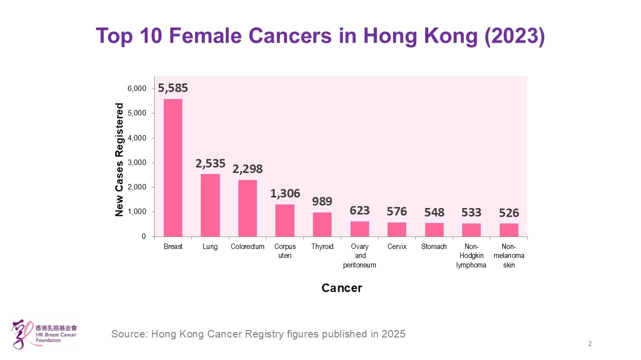 - In 2022, for the first time, breast cancer (including male breast cancer) surpassed colorectal cancer to become the second most common cancer in Hong Kong.