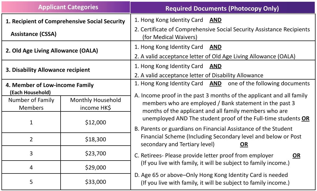 Eligibility Applicants: who are 40 – 74 years old, HKID Card holders, have never undergone mammogram and meet one of the application categories as below.