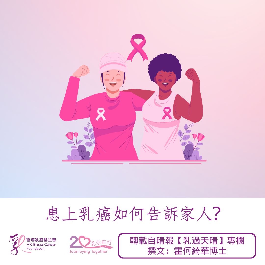 確診乳癌的一刻,很多人會感到震驚、沮喪,甚至難以接受,這些都是正常反應。很多時候,患者還未安頓自己的情緒,就要掙扎如何將病情告知家人,尤其是年幼的子女和年邁的父母,這往往是令人心碎、難以開口的話題。到底應該告訴孩子嗎?怎樣開口跟他們說?