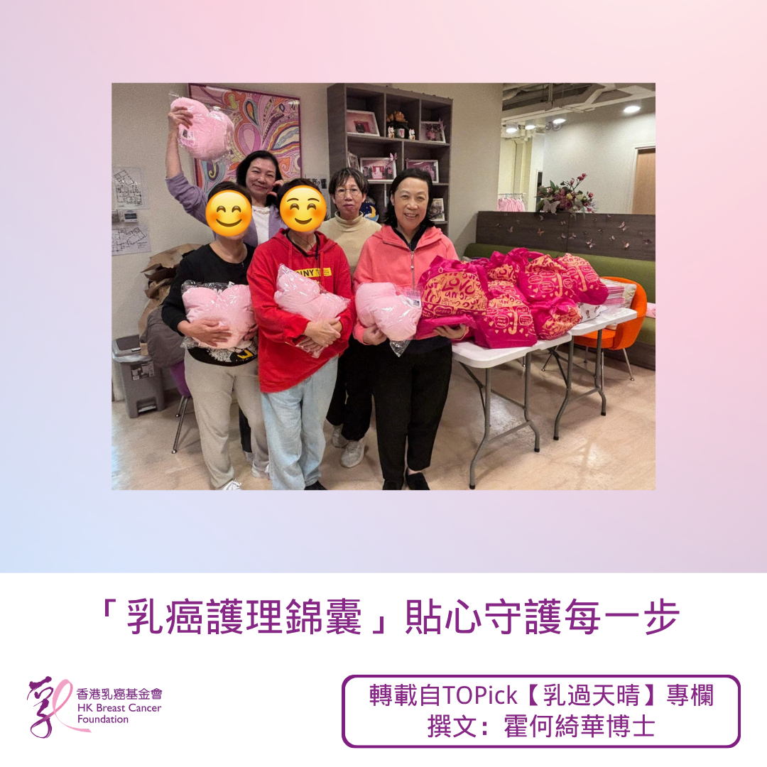 「在我完成乳房手術出院時,收到一個『乳癌護理錦囊』,感到很窩心。袋中的物品正是我在治療過程中最需要的支持。」患上第二期乳癌的Gigi(化名)透過錦囊,認識了香港乳癌基金會並登記成為會員,其後更參與每週的患者支援小組,與同路人交流心得及資訊,陪伴她走過艱辛的化療歷程。